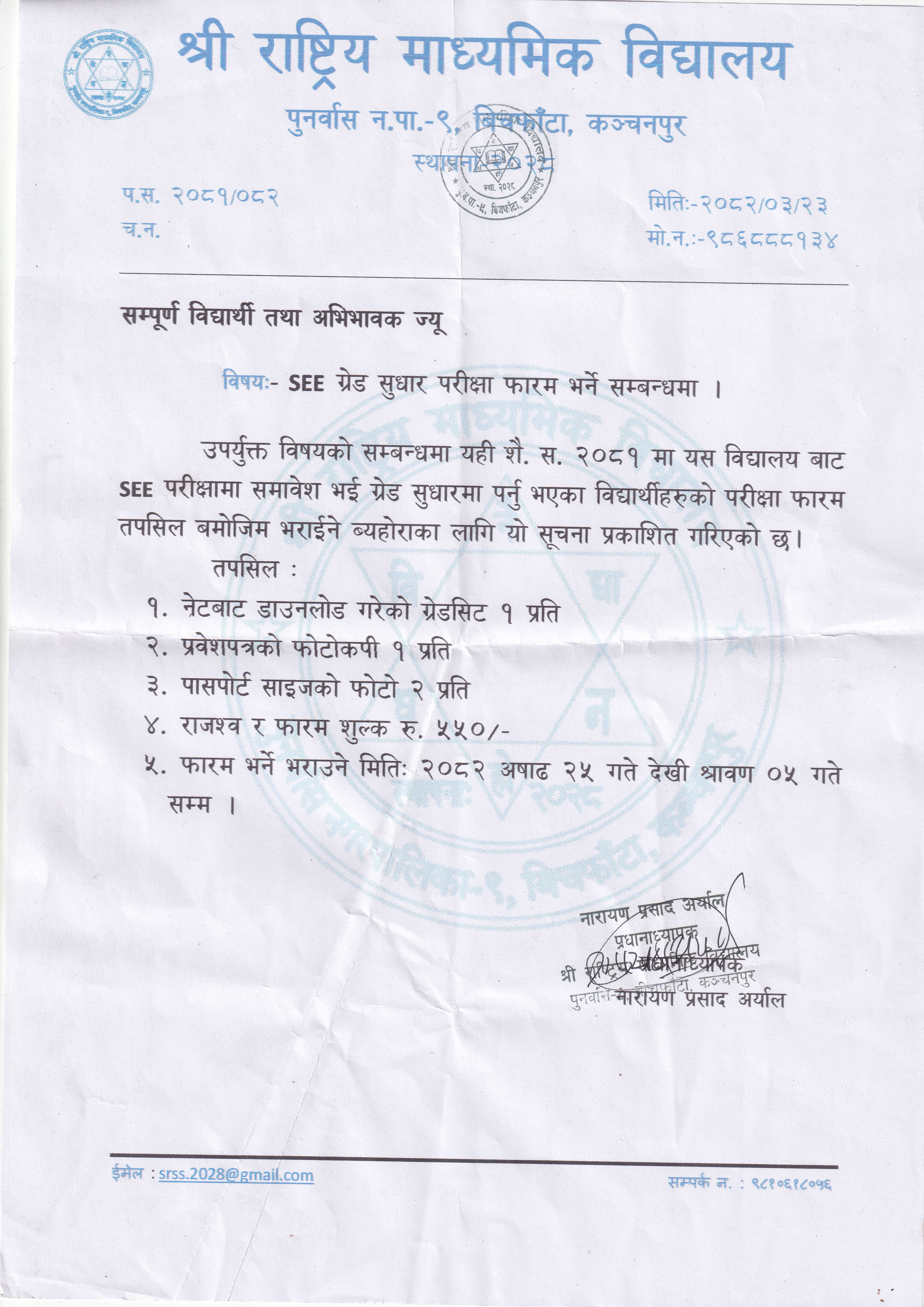 माध्यमिक शिक्षा परीक्षा 20८१ मा सहभागी Not Graded परीक्षार्थीहरुलाई यथाशीघ्र विद्यालयमा आई ग्रेड वृद्धि परीक्षा फारम भर्न हुन यो सूचना प्रकाशित गरिएको छ ।